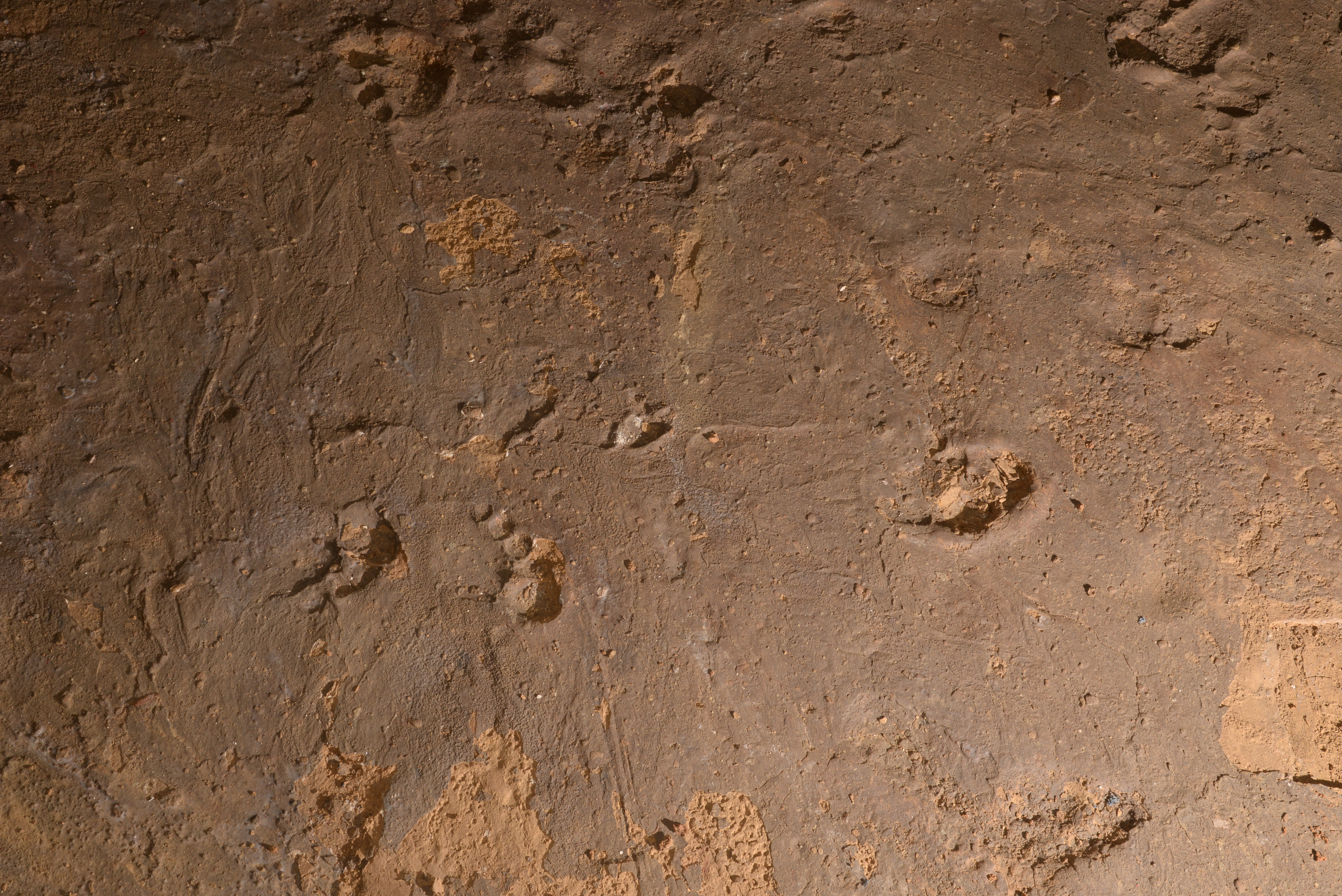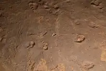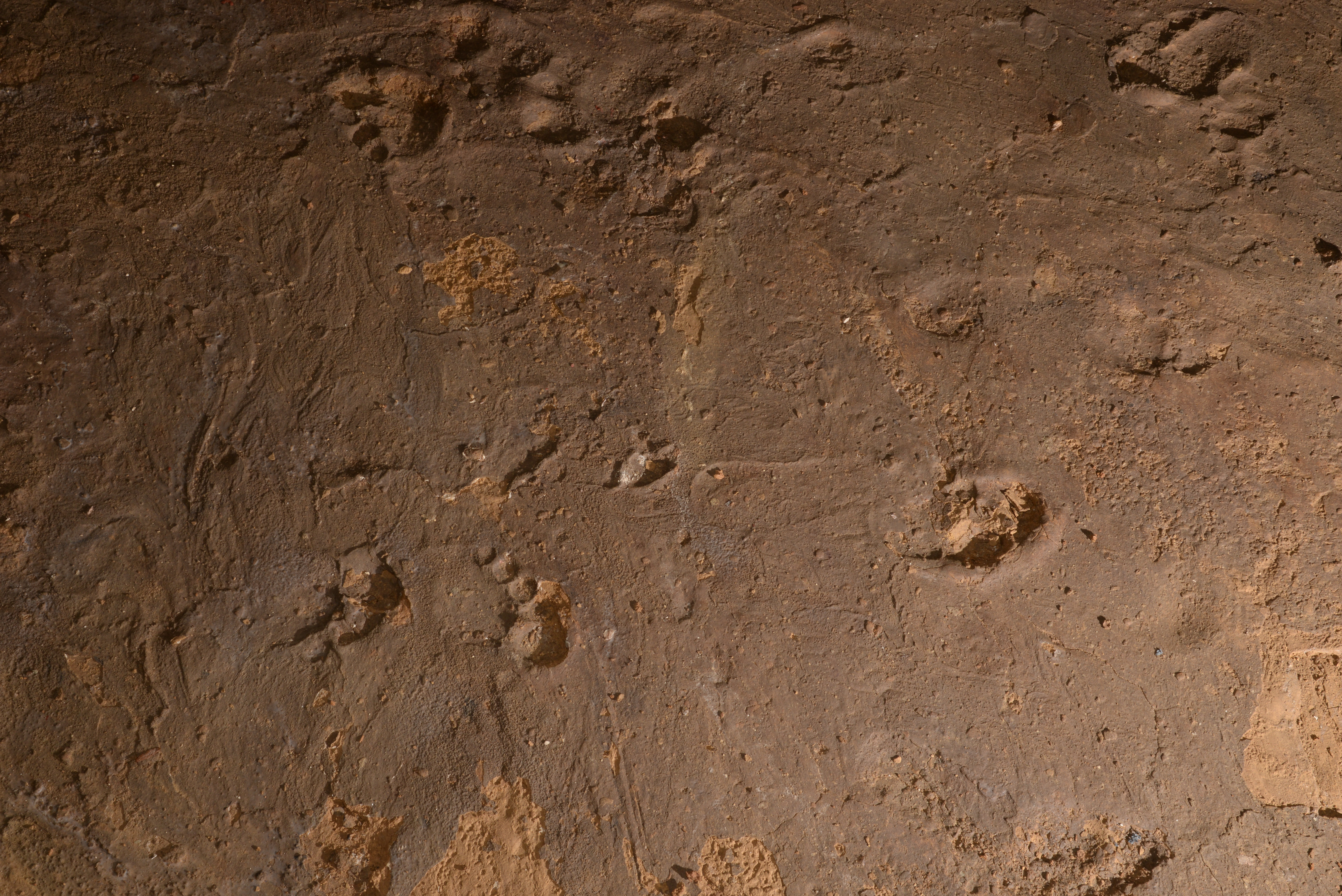 A total of seven footprints belong to this event. In the southern part of sector C, four footprints could be assigned to subject S11, all belonging to a short trackway - right (S11-4), left (S11-3), right (S11 - 2) and left (S11-1) (Fig. 16). Together with subject S11, subject S13 walked into the cave playing. Subject S13 walked immediately in front of subject S11, which is suggested by superimpositions of footprints of the two subjects (Fig. 17). The three footprints of subject S13 were identified as one trackway - left (S13-3), right (S13-2) and right (S13-1), whereas the footprint in between could not be found (Fig. 16).
