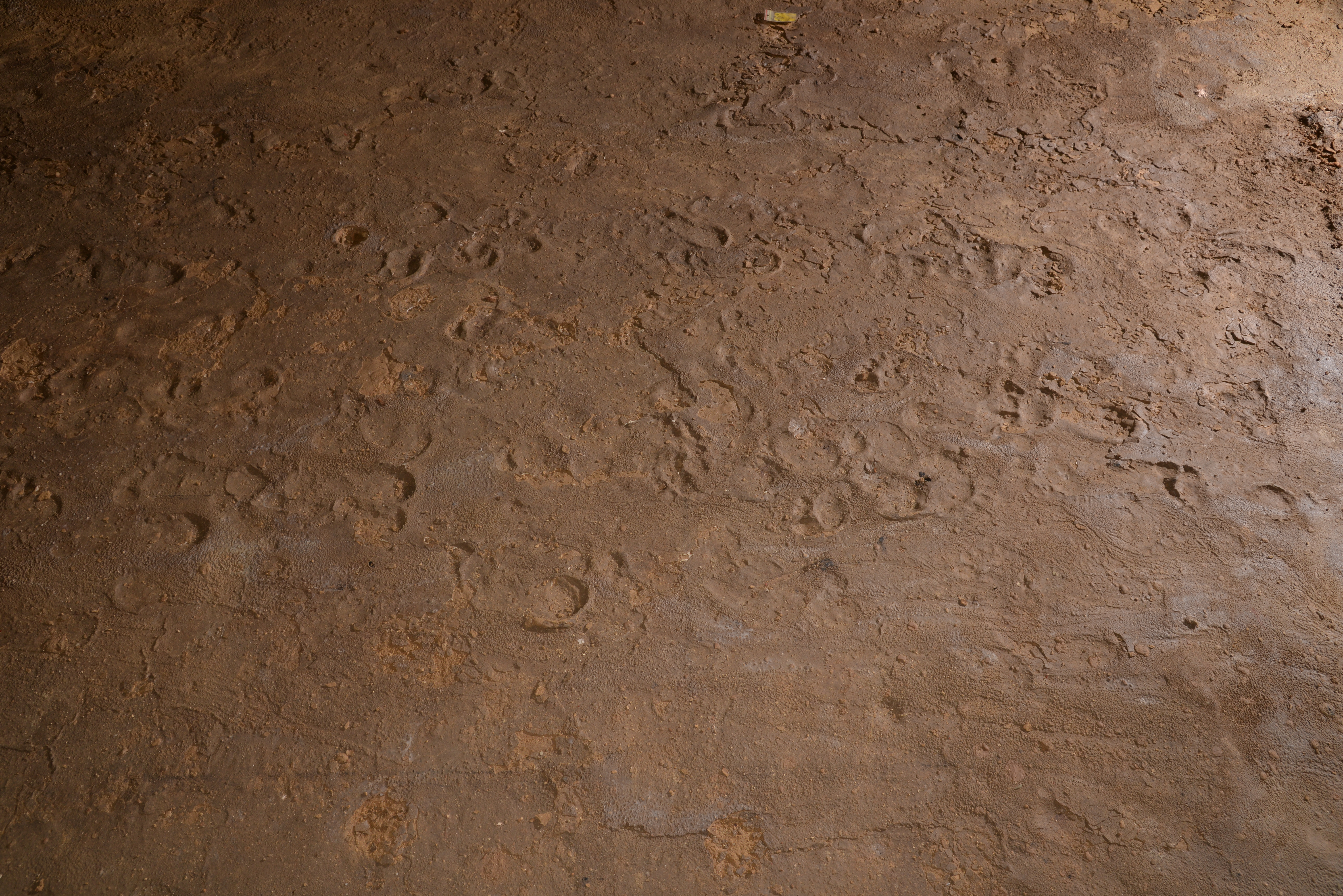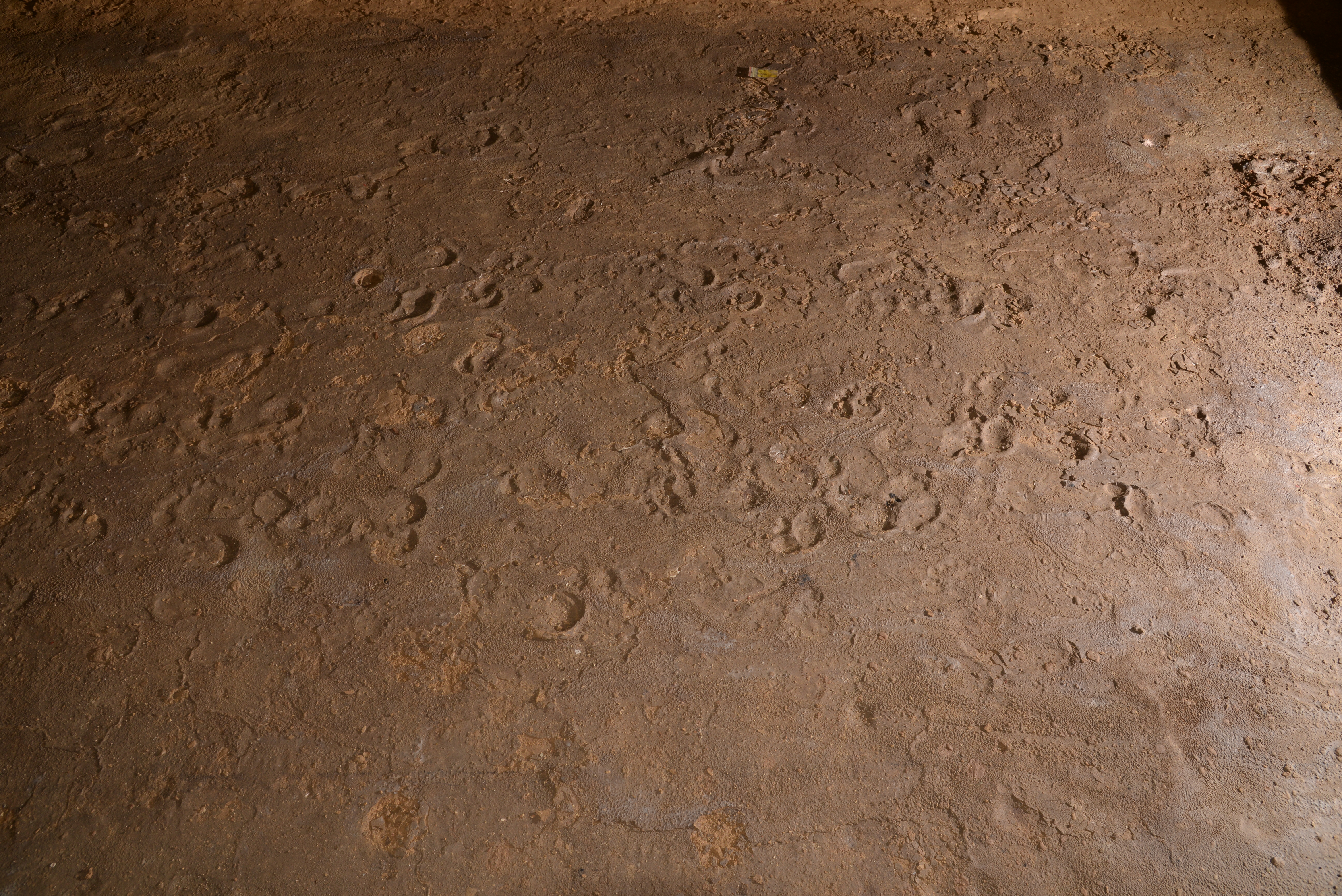 Six footprints that were identified as belonging to subject S14, a female adult, contain a special detail. Five of the six footprints form a trackway in the central part of sector C – left (S14-1), left (S14-2), right (S14-3), left (S14-4) and right (S14 - 5) (Fig. 19). While walking on the central axis of the chamber into the direction to the Mesolithic entrance and carrying additional weight, she changed speed from fast (S14-1) to slow (S14-2 to S14-5) to then accelerate again (S14-6) (Fig. 23). S14-6 is one isolated left footprint in the northern part of sector C that belongs probably to the same event despite the long distance between both spots. During the passage of the slow walk, subject S14 did a slight step to the left out of the walking axis, with the forepart of the foot sunk in deeply into the ground (Figs. 19 & 21). The whole event is interpreted as follows: Subject S14 carried a baby on her back, walked fast at first and then slowed down in the central area of sector C in order to push up the baby on her back into the right position. To do this, she made the slight step to the side and sunk with her forefoot deeper into the ground. Then she increased her speed again.