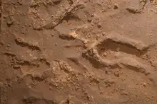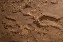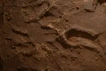 Also, in a relatively central position of sector D, subject S14, a female adult, slipped with her right foot (S14-9) in slow speed in direction to the Mesolithic entrance. Even though she carried additional weight, subject S14 managed to place both feet next to each other - left (S14-7) and right (S14-8) - and thus maintained balance just in front of a low but noticeable step, the eastern edge of the sinter basin, forming this interesting trackway (Figs. 26 & 29).